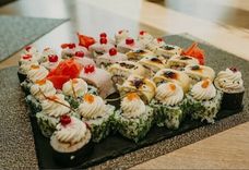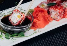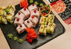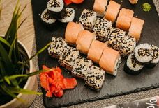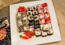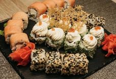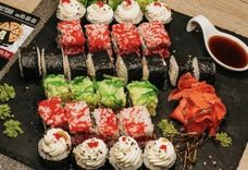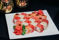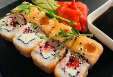 250 г • Нори, рис, лосось, тобико, сыр, имбирь, васаби