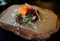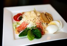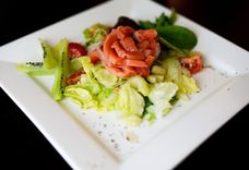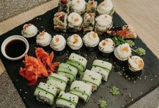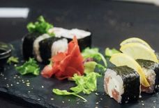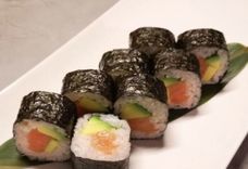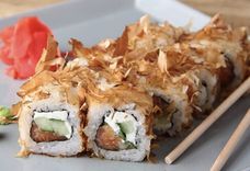 225 г • Нори, рис, лосось, сыр, огурец, стружка тунца, имбирь, васаби
