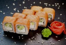 240 г • Нори, рис, лосось, сыр, авокадо, имбирь, васаби