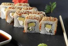 243 г • Нори, рис, угорь, сыр, огурец, соус терияки, кунжут, имбирь, васаби